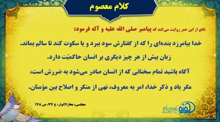 «ویژگی مؤمن این است که او: در دین نیرومند، در نرمی محتاط، در یقین با ایمان، در فهمیدن حریص، در هدایت با نشاط و در پایداری نیکوکار و به هنگام شهوت، چشم پوش، در بردباری دانا، در هنگام مدارا سپاسگزار، در حق سخاوتمند، در ثروتمندی میانه رو، در دوران تنگدستی آراسته، به هنگام قدرت عفوکننده، در پند و خیرخواهی فرمانبردار، در رغبت پرهیزکار، در جهاد حریص، در عین مشغولیت نمازگزار، در سختی شکیبا، در پیشامدها با وقار، در ناملایمات بسیار شکیبا، در رفاه سپاسگزار است، او غیبت نمی کند، تکبّر نمی ورزد، ستم نمی کند، اگر به او ستمی شد، شکیباست و پیوند خویشاوندی را قطع نمی کند، او نه سست است نه بد خلق و نه خشن، چشمش از او پیشی نمی گیرد (یعنی در اختیار اوست) و شکمش او را رسوا نمی سازد و آلت جنسی اش بر او چیره نمی شود، به مردم حسد نمی ورزد، افترا نمی بندد، بیهوده خرج نمی کند و اسراف نمی نماید، بلکه همواره میانه رو است، ستمدیده را یاری می کند و به تهی دستان دلسوزی و ترحّم می کند، جانش از او در زحمت و مردم از او در آسایشند، به عزّت و شکوه دنیا رغبتی ندارد و از درد آن بی تابی نمی کند، مردم دارای خواسته هایی هستند که بدان روی می آورند و خواسته ای دارد که بدان مشغول است. در بردباری او کاستی دیده نمی شود و در رأی او سستی نیست و در دینش تباهی نیست، هر که با او مشورت کند او را راهنمایی می کند و هر که از او کمک بطلبد یاریش می کند، او از باطل، دشنام و نادانی گریزان است.»خصال شیخ صدوق، ترجمه جعفری، ج 2، ص 373.